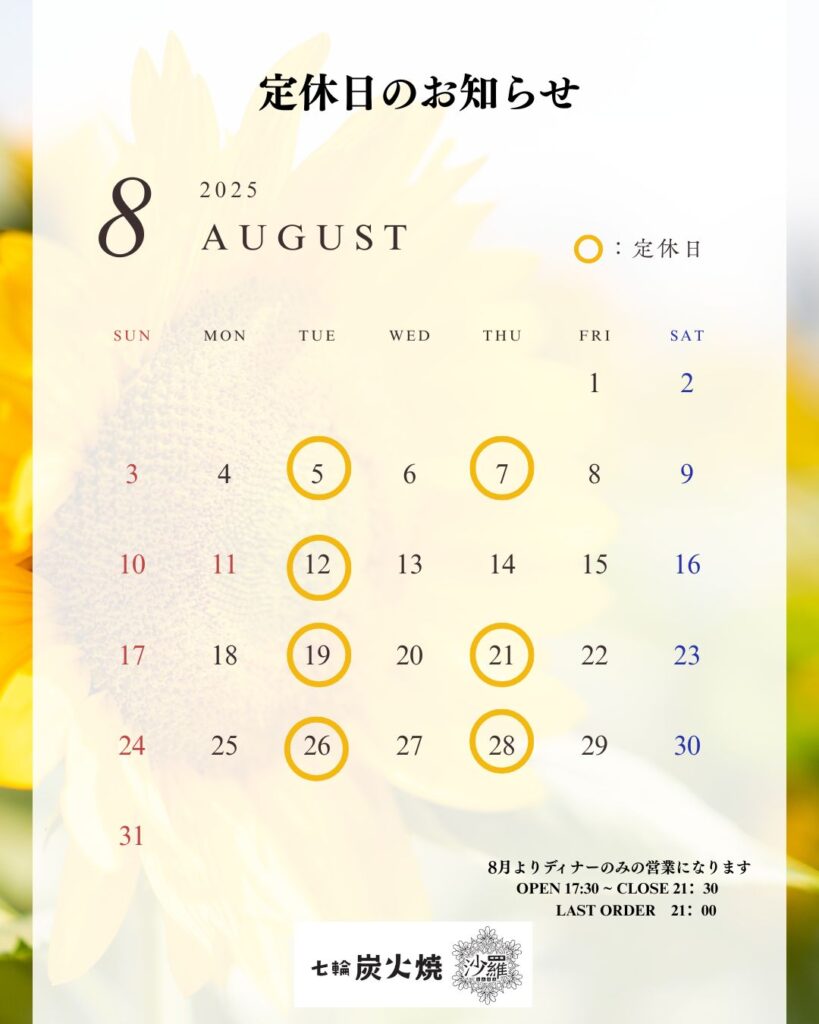 8月の定休日のお知らせ